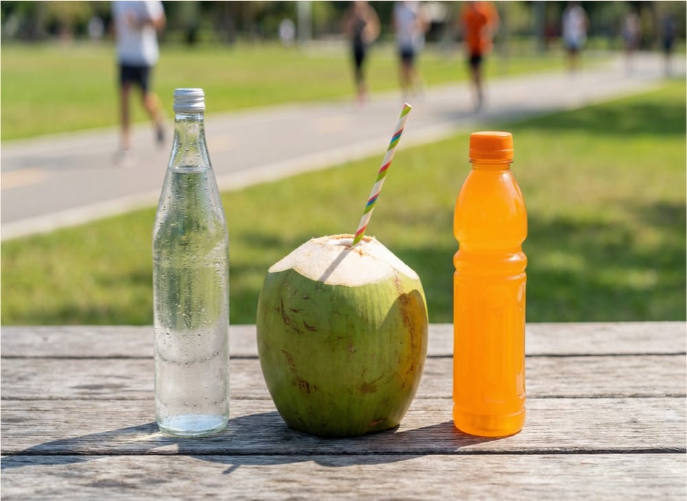 A água de coco surge como alternativa natural interessante. Possui boa hidratação, é leve para o intestino e rica em potássio. Contudo, apresenta baixo teor de sódio, justamente o eletrólito mais perdido no suor limitando a eficácia isolada em esforços prolongados.